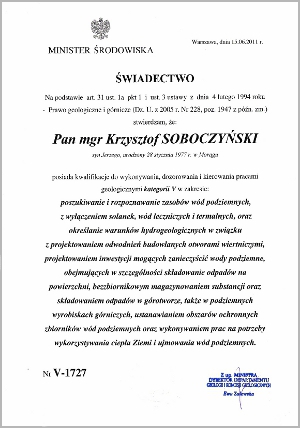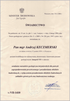 Warto korzystać z usług firm zatrudniających osoby posiadające uprawnienia geologiczne. Jest to gwarancja jakości świadczonych usług. Potwierdzeniem uzyskanych kwalifikacji oraz fachowej wiedzy jest wydane przez Ministra Środowiska świadectwo.